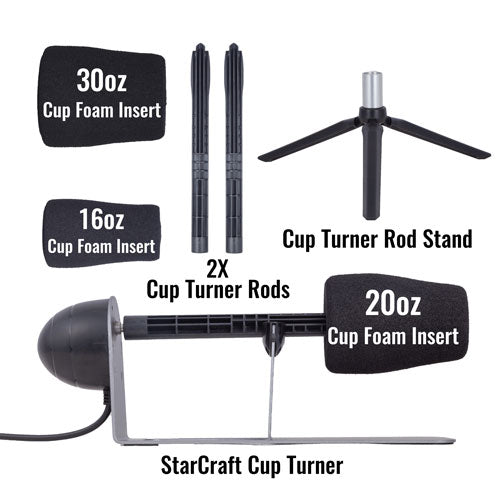 Say hi to the StarCraft Cup Turner! This easy-to-use quality grade aluminum cup tuner is both sleek in design as well as durable in construction. The fast 5/6 RPM, 2-way rotation motor is perfect for using mediums with runny or thicker viscosity. The 2-way motor changes turn direction from clockwise to counterclockwise with a flip of a switch.